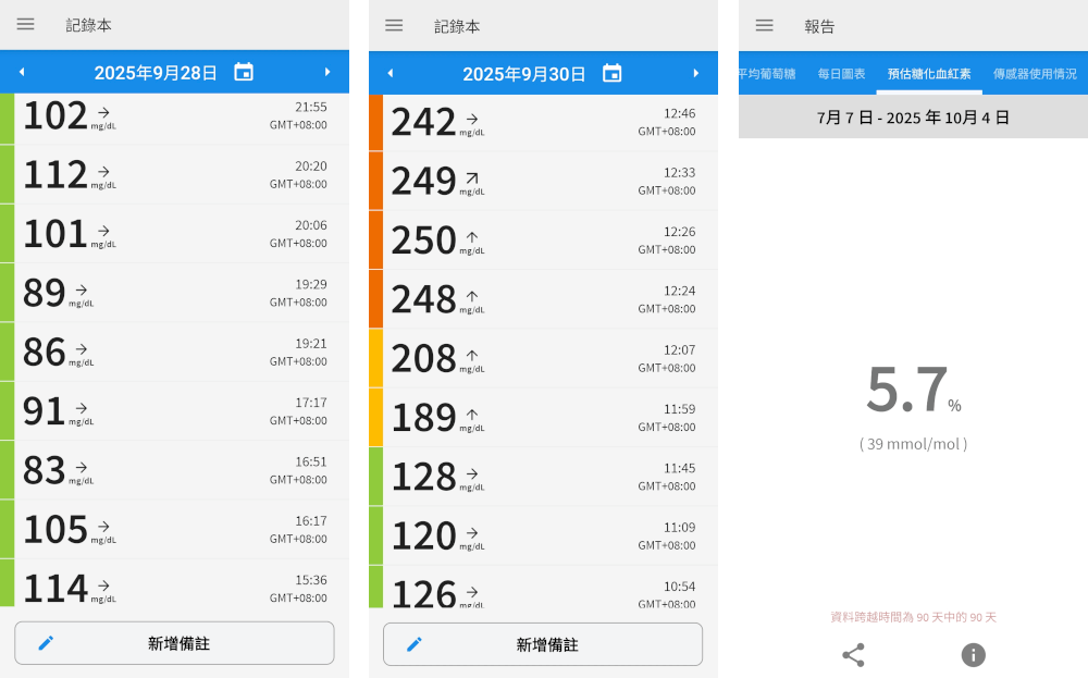 上圖中間則是兩天後吃廣東炒麵的結果,因為升破200,所以服用一顆降血糖藥。